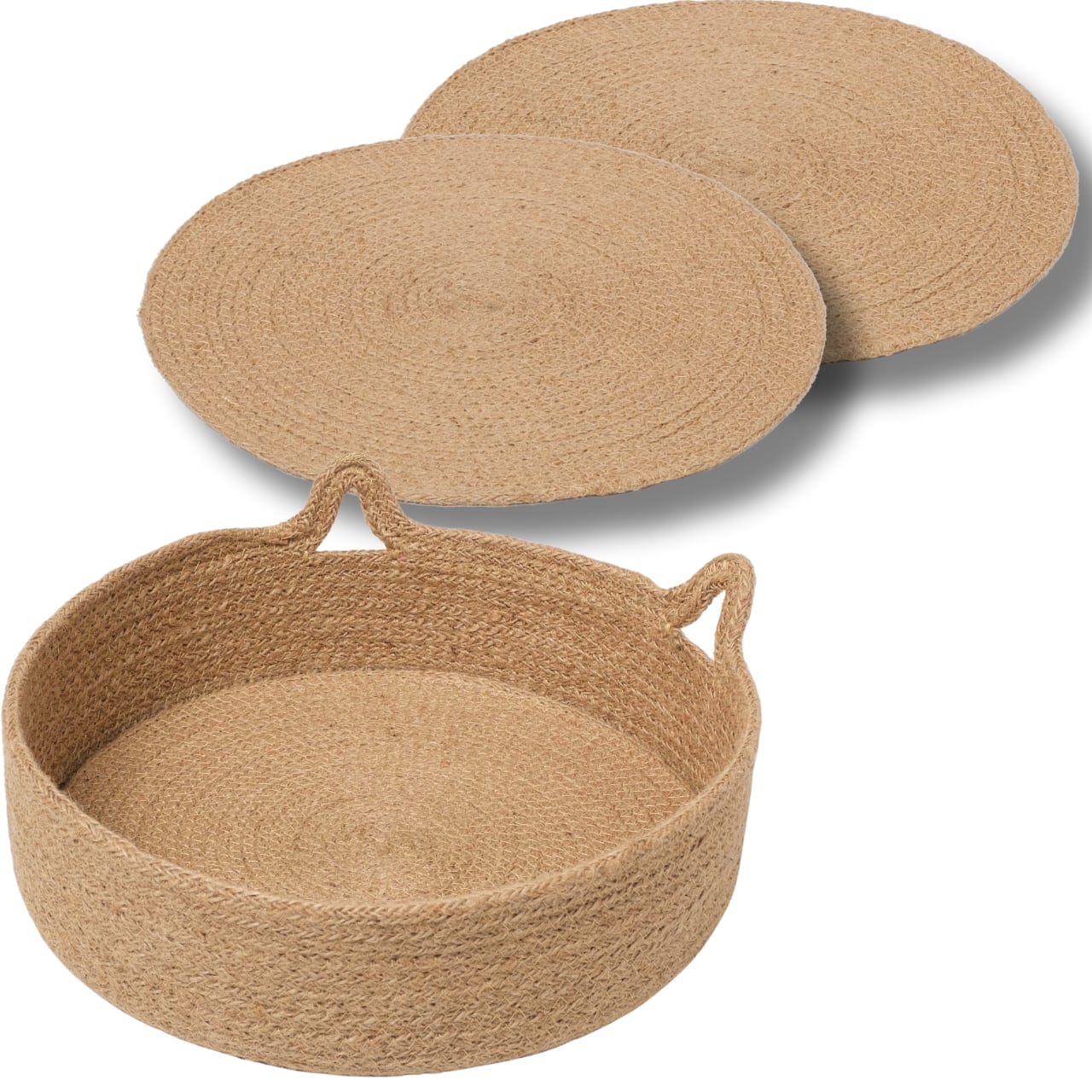 【マット付きで長く使える工夫を】 底がボロボロにならないよう、あらかじめ保護用のマットをセットにしました。リサイクルコットンタイプにもジュートタイプにも、それぞれマットが2枚付属。取り替えながら使えるので、清潔&快適な状態を長く保てます♪